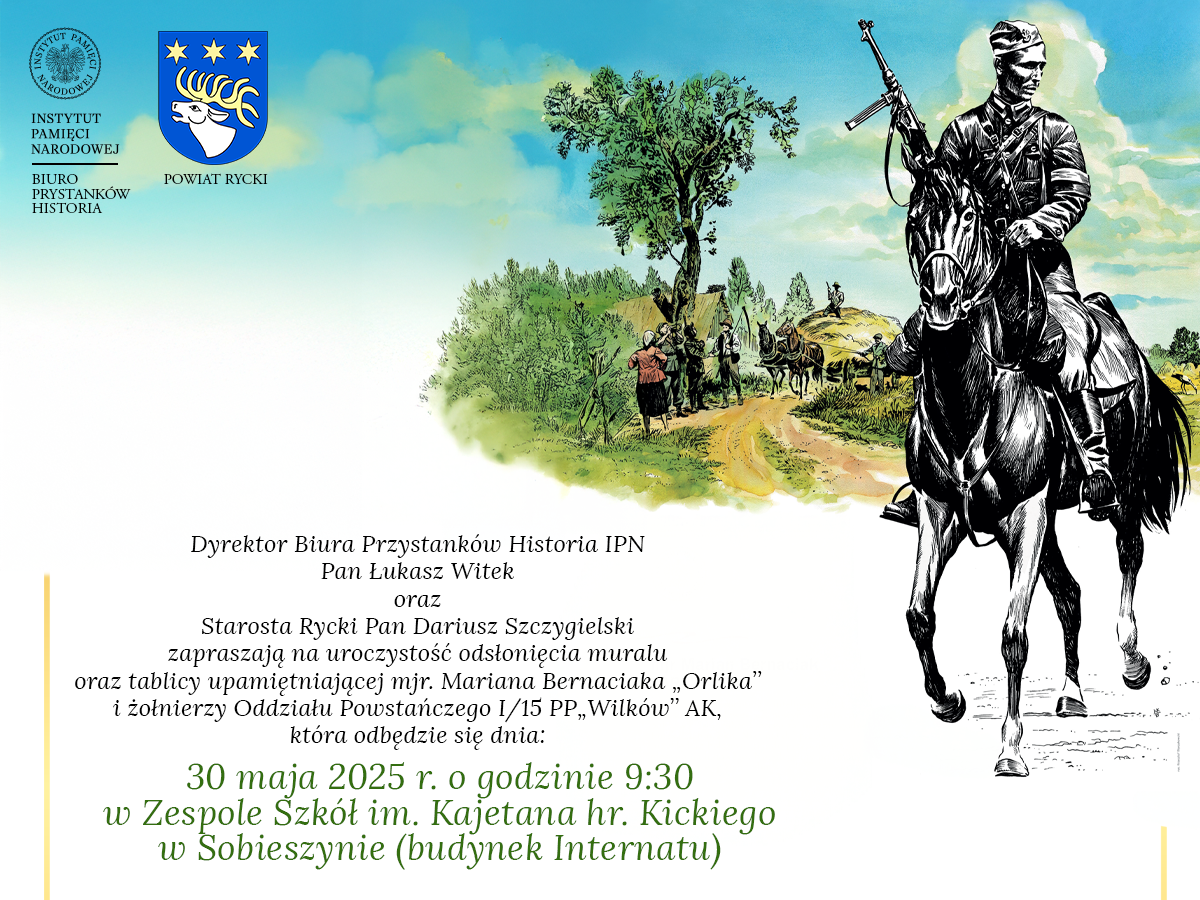 W związku z przypadającą w tym roku 80. rocznicą jednej z najważniejszych bitew partyzanckich oraz 80-leciem rozbicia Powiatowego Urzędu Bezpieczeństwa Publicznego w Puławach, Biuro Przystanków Historia Instytutu Pamięci Narodowej wraz ze Starostwem Powiatowym w Rykach organizuje w dniu 30 maja 2025 roku wyjątkowe wydarzenia mające na celu upamiętnienie bohaterskich czynów majora Mariana Bernaciaka ps. „Orlik” oraz żołnierzy jego zgrupowania.